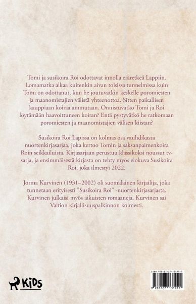 Tomi ja susikoira Roi odottavat innolla eräretkeä Lappiin. Lomamatka alkaa kuitenkin aivan toisissa tunnelmissa kuin Tomi on odottanut, kun he joutuvatkin keskelle poromiesten ja maanomistajien välistä yhteenottoa. Sitten paikallisen kauppiaan koiraa ammutaan. Onnistuvatko Tomi ja Roi löytämään haavoittuneen koiran? Entä pystyvätkö he ratkomaan poromiesten ja maanomistajien välisen kiistan? Susikoira Roi Lapissa on kolmas osa vauhdikasta nuortenkirjasarjaa, joka kertoo Tomin ja saksanpaimenkoira Roin seikkailuista. Kirjasarjaan perustuu klassikoksi noussut tv-sarja, ja ensimmäisestä kirjasta on tehty myös elokuva Susikoira Roi, joka ilmestyi 2022.