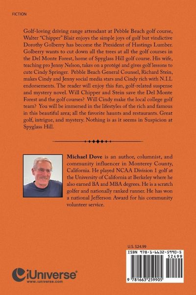 Golf-loving driving range attendant at Pebble Beach golf course, Walter "Chipper" Blair enjoys the simple joys of golf but vindictive Dorothy Golberry has become the President of Hastings Lumber. Golberry wants to cut down all the trees at all the golf courses in the Del Monte Forest, home of Spyglass Hill golf course. His wife, teaching pro Jenny Nelson, takes on a protégé and gives golf lessons to cute Cindy Springer. Pebble Beach General Counsel, Richard Stein, makes Cindy and Jenny social media stars and Cindy rich with N.I.L endorsements. The reader will enjoy this fun, golf-related suspense and mystery novel. Will Chipper and Stein save the Del Monte Forest and the golf courses? Will Cindy make the local college golf team? You will be immersed in the lifestyles of the rich and famous in this beautiful area; all the favorite haunts and restaurants. Great golf, intrigue, and mystery. Nothing is as it seems in Suspicion at Spyglass Hill.