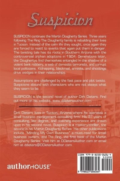 SUSPICION continues the Martin Dougherty Series. Three years following The Ring The Dougherty family is rebuilding their lives in Tucson. Instead of the calm life they sought, once again they are forced to react to events that again put them in danger. The twisting tale has its roots in Southern Arizona with the controversial orphan adoptions in 1904. Generations later, the Doughertys find themselves entangled in the shadow of a violent bank robbery, a web of domestic terrorists, and corrupt local politicians. Kidnapping, blackmail, arrests, and shootings drive wedges in their relationships. Assumptions are challenged by the fast pace and plot twists. Suspicions abound with characters who are not always what they seem to be. SUSPICION is the second novel of author Dirk Dieters. Find out more on his website, www.ddietersauthor.com.