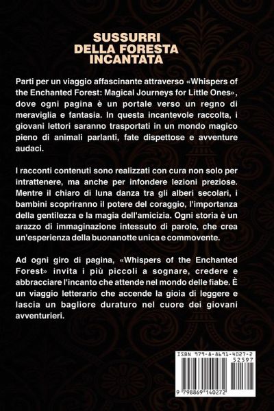 Parti per un viaggio affascinante attraverso Whispers of the Enchanted Forest: Magical Journeys for Little Ones, dove ogni pagina è un portale verso un regno di meraviglia e fantasia. In questa incantevole raccolta, i giovani lettori saranno trasportati in un mondo magico pieno di animali parlanti, fate dispettose e avventure audaci. I racconti contenuti sono realizzati con cura non solo per intrattenere, ma anche per infondere lezioni preziose. Mentre il chiaro di luna danza tra gli alberi secolari, i bambini scopriranno il potere del coraggio, l'importanza della gentilezza e la magia dell'amicizia. Ogni storia è un arazzo di immaginazione intessuto di parole, che crea un'esperienza della buonanotte unica e commovente. Ad ogni giro di pagina, Whispers of the Enchanted Forest invita i più piccoli a sognare, credere e abbracciare l'incanto che attende nel mondo delle fiabe. È un viaggio letterario che accende la gioia di leggere e lascia un bagliore duraturo nel cuore dei giovani avventurieri.
