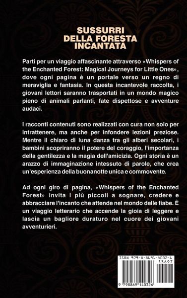 Parti per un viaggio affascinante attraverso Whispers of the Enchanted Forest: Magical Journeys for Little Ones, dove ogni pagina è un portale verso un regno di meraviglia e fantasia. In questa incantevole raccolta, i giovani lettori saranno trasportati in un mondo magico pieno di animali parlanti, fate dispettose e avventure audaci. I racconti contenuti sono realizzati con cura non solo per intrattenere, ma anche per infondere lezioni preziose. Mentre il chiaro di luna danza tra gli alberi secolari, i bambini scopriranno il potere del coraggio, l'importanza della gentilezza e la magia dell'amicizia. Ogni storia è un arazzo di immaginazione intessuto di parole, che crea un'esperienza della buonanotte unica e commovente. Ad ogni giro di pagina, Whispers of the Enchanted Forest invita i più piccoli a sognare, credere e abbracciare l'incanto che attende nel mondo delle fiabe. È un viaggio letterario che accende la gioia di leggere e lascia un bagliore duraturo nel cuore dei giovani avventurieri.