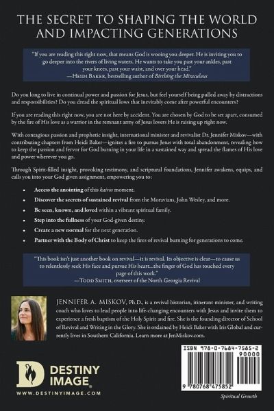 The Secret to Shaping the World and Impacting Generations "If you are reading this right now, that means God is wooing you deeper. He is inviting you to go deeper into the rivers of living waters. He wants to take you past your ankles, past your knees, past your waist, and over your head." -Heidi Baker, bestselling author of Birthing the Miraculous Do you long to live in continual power and passion for Jesus, but feel yourself being pulled away by distractions and responsibilities? Do you dread the spiritual lows that inevitably come after powerful encounters? If you are reading this right now, you are not here by accident. You are chosen by God to be set apart, consumed by the fire of His love as a warrior in the remnant army of Jesus lovers He is raising up right now. With contagious passion and prophetic insight, international minister and revivalist Dr. Jennifer Miskov-with contributing chapters from Heidi Baker-ignites a fire to pursue Jesus with total abandonment, revealing how to keep the passion and fervor for God burning in your life in a sustained way and spread the flames of His love and power wherever you go. Through Spirit-filled insight, provoking testimony, and scriptural foundations, Jennifer awakens, equips, and calls you into your God given assignment, empowering you to: Access the anointing of this kairos moment. Discover the secrets of sustained revival from the Moravians, John Wesley, and more. Be seen, known, and loved within a vibrant spiritual family. Step into the fullness of your God-given destiny. Create a new normal for the next generation. Partner with the Body of Christ to keep the fires of revival burning for generations to come. "This book isn't just another book on revival-it is revival. Its objective is clear-to cause us to relentlessly seek His face and pursue His heart...the finger of God has touched every page of this work." -Todd Smith, overseer of the North Georgia Revival