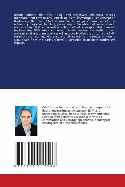 Results indicate that the hiking trail negatively influences species distribution but have minimal effects on plant assemblages. The concept of Biodiversity Net Gain (BNG) is essential to mitigate these impacts by enhancing degraded habitats, promoting sustainable trail management, and ensuring that conservation actions offset ecological disturbances. Implementing BNG principles through habitat restoration, buffer zones, and sustainable tourism practices will improve biodiversity outcomes in SKP. Based on the findings, relocating the hiking trail to the slopes of Mount Sinai away from the basins (Farshs) is advisable to mitigate biodiversity impacts.