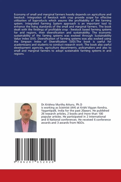 Economy of small and marginal farmers heavily depends on agriculture and livestock. Integration of livestock with crop provide scope for effective utilization of byproducts which assures the profitability of the farming system. Integrated Farming System approach is an important tool to enhance the living standards of the small and marginal farmers. The book dealt with the findings of profitable crop - livestock based farming systems for arid regions, their diversification and sustainability. The economic sustainability of the faming systems was evolved through Sustainability Value Index (SVI). Diversification of farming systems was also evolved using the Simpson Index of Diversification (SID).The book is useful for academicians and students to conduct research work. The book also useful development agencies, agriculture departments, policymakers and also to small and marginal farmers to adopt sustainable farming systems in arid regions.