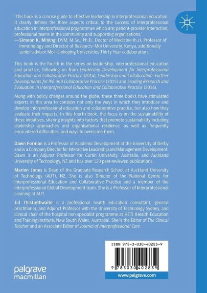 This book is the fourth in the series on leadership, interprofessional education and practice, following on from Leadership Development for Interprofessional Education and Collaborative Practice (2014), Leadership and Collaboration: Further Developments for IPE and Collaborative Practice (2015) and Leading Research and Evaluation in Interprofessional Education and Collaborative Practice (2016).