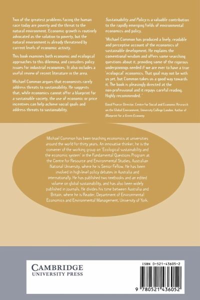 Two of the greatest problems facing the human race today are poverty and the threat to the natural environment. Economic growth is routinely advocated as the solution to poverty, but the natural environment is already threatened by current levels of economic activity. This compelling book examines both economic and ecological approaches to this dilemma, and considers policy issues for industrial economies. It also includes a useful review of recent literature in the area. Michael Common argues that economists rarely address threats to sustainability. He suggests that, while economics cannot offer a blueprint for a sustainable society, the use of economic or price incentives can help achieve social goals and address threats to sustainability.This book is a balanced, constructive and original contribution in the rapidly emerging fields of environmental economics and policy.