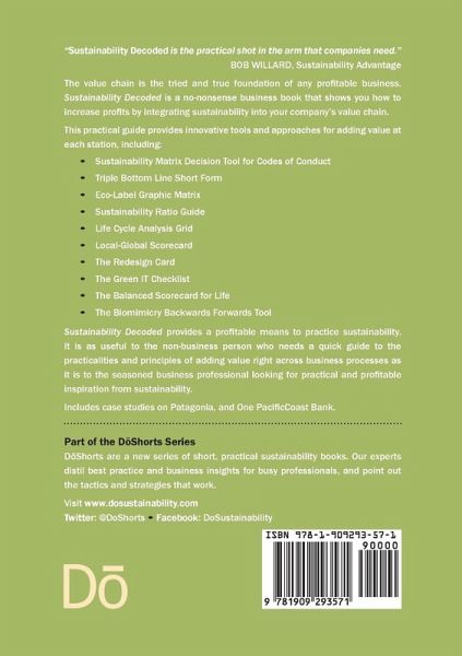 The value chain is the tried and true foundation of any profitable business. Sustainability Decoded is a no-nonsense business book that shows you how to increase profits by integrating sustainability into your company's value chain. This practical guide provides innovative tools and approaches for adding value at each station, including: ¿ Sustainability Matrix Decision Tool for Codes of Conduct ¿ Triple Bottom Line Short Form ¿ Eco-Label Graphic Matrix ¿ Sustainability Ratio Guide ¿ Life Cycle Analysis Grid ¿ Local-Global Scorecard ¿ The Redesign Card ¿ The Green IT Checklist ¿ The Balanced Scorecard for Life ¿ The Biomimicry Backwards Forwards Tool Sustainability Decoded provides a profitable means to practice sustainability. It is as useful to the non-business person who needs a quick guide to the practicalities and principles of adding value right across business processes as it is to the seasoned business professional looking for practical and profitable inspiration from sustainability. Includes case studies on Patagonia and One PacificCoast Bank.