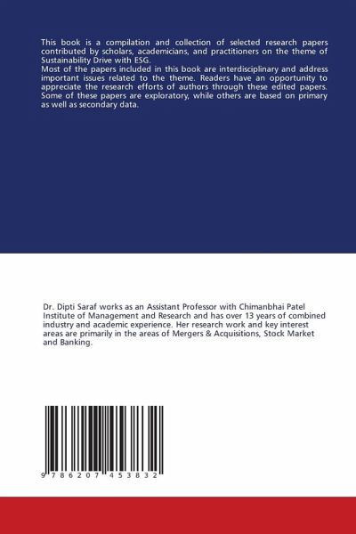 This book is a compilation and collection of selected research papers contributed by scholars, academicians, and practitioners on the theme of Sustainability Drive with ESG. Most of the papers included in this book are interdisciplinary and address important issues related to the theme. Readers have an opportunity to appreciate the research efforts of authors through these edited papers. Some of these papers are exploratory, while others are based on primary as well as secondary data.