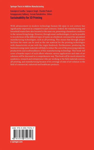With advancement in modern technology human life span in 21st century has significantly improved as compared to past centuries. Indeed, the manufacturing and household wastes have also boosted in the same era, presenting a hazardous condition to the various living beings. However, through smart methodologies, it can be possible to recycle/reuse of the different types of wastes as a feedstock convenient for specialized manufacturing technologies, such as 3D printing. This means that through proper facilities the waste can be used as the raw material for the printing technologies with characteristic at par with the virgin feedstock. Furthermore, producing the feedstock using waste materials will help to reduce the cost of the processing material, productivity and eco-friendliness of this manufacturing technology. This book will cover a boarder aspect of such efforts wherein various applications and state of art solutions will be discussed in a comprehensive way. This book will be much interest for academics, research and entrepreneur who are working in the field materials science, 3D printing, and manufacturing because of its coverage of state of art solution in the field of commercial, industrial and healthcare products.