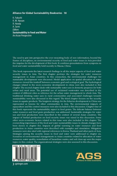 Water Resources Management.- Sustainable Water Resource Management in China: A Great Challenge.- Affecting Factors of Salinity Intrusion in Pearl River Estuary and Sustainable Utilization of Water Resources in Pearl River Delta.- Water Resource Management in Asian Cities - Case Studies of Groundwater Management.- Identification of Main Factors and Their Relationships in Urban Runoff Pollution of Macau Based on Statistical Techniques.- Assessment of Spatial Variations in Surface Water Quality of Kyeongan Stream, South Korea Using Multi-Variate Statistical Techniques.- Real-Time Water Resources Analysis and Assessment for Supporting Beijing Water Sustainability.- A GIS-Based Bio-Economic Model Applied in Water Resource Management in Shiyang River Basin, Gansu Province, China.- On the Change of Virtual Water in China under Regional Restructuring from 1997 to 2000.- Sustainability in Local Water Use.- Potential Reuse of Wastewater Effluent in Macau.- Ozone Used as a Technology for Reducing the Risk of Wastewater Reuse.- Sustainable Water Management of Reclaimed Water Use: Case Study of Tianjin.- Organic Hindrance in Groundwater Arsenic Removal Practice.- Factors Associated with Faecal Contamination of Household Drinking Water in a Rural Area, Vietnam.- Alternative Safe Water for Communities in the Mekong Delta and Coastal Zone: Vietnam.- Community Based Management of Traditional Water Resources in Western Himalayan Region.- Aquatic Food Production.- Quality and Safety of Aquatic Products in China.- Notes of Study on Development Strategy of Chinese Fishery to 2030.- Changes in Fisheries and Water Environments of Lake Taihu, China.- Wastewater Management in Freshwater Pond Aquaculture in China.- Dosing and Timing Addition of Bacterial Biomass for Improving the WaterEnvironment in Shrimp Farming.- Study of Mercury Pollution at Bantarpanjang Area (Citarum River) Using Biomarker.- Crop Production.- Increased Wheat Yield by Rainwater Management: A Case Study in Arid Lands of Iran.- Water - An Emerging Critical Factor in Chinese Rice Production and Trade.- Sustainability of Water-Use and Food Production in the Haihe Catchment.- Exploring Land Use Planning Options: Experiences and Challenges for Food and Water Security.- The Impact of the Bio-Ethanol Production to the World Grain Market: A Case Study of World Maize Market.- Optimization of Rice Supply Chain in Thailand: A Case Study of Two Rice Mills.- Exploring Behavioral Changes towards Chemical-Safe Agriculture: The Case of Thai Vegetable Farmers.- Supply-Demand Balance of Compost between Urban and Agricultural Sectors According to Peri-Urban Development in an Urban-Rural Fringe Area in Asia: A Case Study in Nonthaburi, Thailand.- Food and Water Security in Climate Changes.- Water Resources in the Hexi Corridor and Its Cycle.- Adaptive Capacity to Changes in the Water Cycle: A Case Study of Northern China.- Measuring Climate Change Risk on Supply Chain of Rice in Bangladesh.- The Multi-Functional Role of Rice Paddy Area for Food and Water Sustainability - Lessons Learned from Korean Tradition.- Promoting Plant Residue Utilization for Food Security and Climate Change Mitigation in Thailand.- No-Regret Adaptation Strategies to Cope with Potential Impacts of Climate Change on Groundwater Resources of Asian Cities.- Environmental Management.- Food or Environment: An Alternative Solution to Tradeoff of Water Allocation in Oasis Regions of China.- Impacts of Water Environment and Conservation for Sustainable Development in Northern Philippines.- Material Flow Analysis of Nitrogen andPhosphorus for Regional Nutrient Management: Case Study in Haiphong, Vietnam.- Application of Sulfur Denitrification Process to Remove Nitrate-nitrogen Discharged from Agricultural Field.- Bioremediation of Soil and Groundwater Contaminated by Volatile Organic Compounds.- Cadmium Extraction from Contaminated Soil Using an Iron Chloride Solution in Asian Countries.- A Strategy in Assessing Plant Residue Material Quality to Enhance Sustainability of Lowland Agricultural Systems.- Redesigning Institutions and Governance Systems for Urban Water Demand Management: Case of Developing City Delhi, India.- The Impact of Regulatory Change on Trading Partners: Race to the Bottom or Convergence to the Top?.