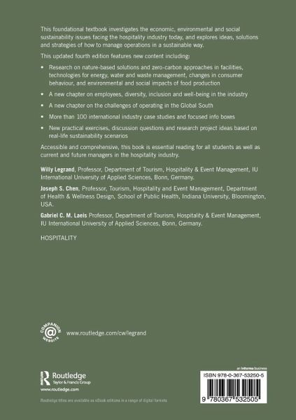 This foundational textbook investigates the economic, environmental, and social sustainability issues facing the hospitality industry today, and explores ideas, solutions, strategies of how to manage operations in a sustainable way.