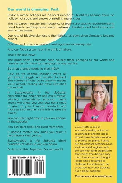 Our world is changing. Fast. Idyllic summer holidays are being disrupted by bushfires bearing down on holiday hot spots and smoke blanketing major cities. The increased intensity and frequency of storms are causing record-breaking flood levels, washing away major highways, livestock and food crops and even entire towns. Our rate of biodiversity loss is the highest it's been since dinosaurs became extinct. Glaciers and polar ice caps are melting at an increasing rate. And our food system is on the brink of failure. That's the bad news. The good news is humans have caused these changes to our world, and humans can fix them by changing the way we live. But that change needs to start NOW. How do we change, though? We've all got jobs to juggle and mouths to feed. The number of hats we're wearing means we're already feeling like we're stretched to our limit. In Sustainability in the Suburbs, environmental engineer and multi-award-winning sustainability educator Laura Trotta will show you that you don't need to give up your favourite comforts and move to a commune in the hills to save the planet. You can start right now. In your own home. In the suburbs. You can start small and build from there. It doesn't matter how small you start; it just matters that you do. Sustainability in the Suburbs offers hundreds of ideas to get you going. So let's do this. Together. For our world.