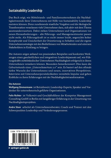 Die Autoren zeigen anhand von praxisnahen Beispielen und konkreten Werkzeugen einen ganzheitlichen und integrativen Leadershipansatz auf, wie Führungskräfte mittelständischer Unternehmen Nachhaltigkeit erfolgreich in ihrem Unternehmen verankern können. Besonders bemerkenswert: Dies kann die Geburtsstunde eines "Unternehmertum 2.0" sein. Es basiert auf den oftmals tiefen Wurzeln des Unternehmens und neuen, innovativen Perspektiven. Interviews mit Unternehmerpersönlichkeiten vermitteln Impulse und geben Einblicke zu ihren Erfahrungen mit der Nachhaltigkeitstransformation.