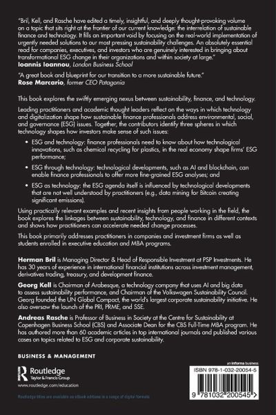 "Bril, Kell, and Rasche have edited a timely, insightful, and deeply thought-provoking volume on a topic that sits right at the frontier of our current knowledge: the interrelation of sustainable finance and technology. It fills an important void by focusing on the real-world implementation of urgently needed solutions to our most pressing sustainability challenges. This book, therefore, is an absolutely essential read for companies, executives, and investors who are genuinely interested in bringing about transformational ESG change in their organizations and indeed, within society at large."