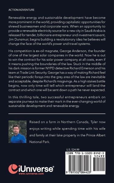 Renewable energy and sustainable development have become more prominent in the world, providing capitalistic opportunities for shrewd businessmen and corporate wars. When an opportunity to provide a renewable electricity source for a new city in Saudi Arabia is released for tender, billionaire entrepreneur and investment savant, Jim Dunsmuir, begins building a revolutionary idea he believes will change the face of the world's power and travel systems. His competition is ex-oil magnate, George Anderson, the founder of one of the largest solar companies in the world. Now he is out to win the contract for his solar power company at all costs, even if it means pushing the boundaries of the law. Stuck in the middle of his dark mission is former NYPD detective Richard Emerson and his team at Trade Link Security. George has a way of making Richard feel like their periodic forays into the grey area of the law are inevitable and acceptable, despite Richard's misgivings. As a high stakes battle begins, now only time will tell which entrepreneur will land the contract and which one will be sent down a path he never expected. In this thrilling tale, two successful entrepreneurs embark on separate journeys to make their mark in the ever-changing world of sustainable development and renewable energy.