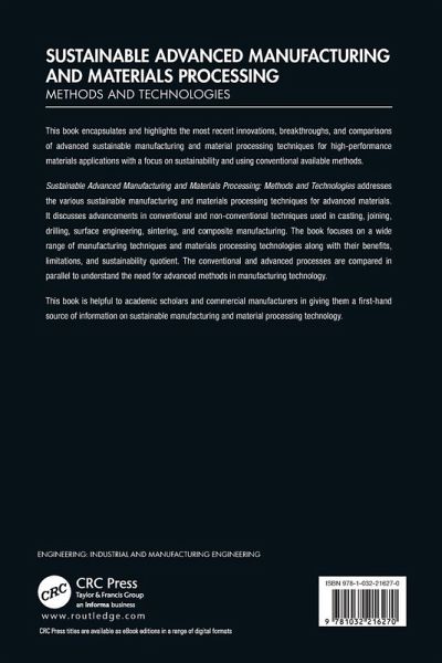 This book encapsulates and highlights the most recent innovations, breakthroughs, and comparisons of advanced sustainable manufacturing and material processing techniques for high-performance materials applications with a focus on sustainability and using conventional available methods.