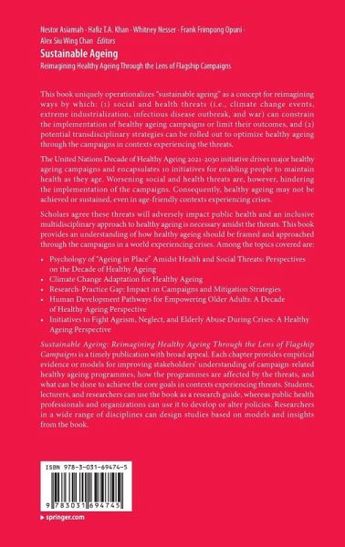 This book uniquely operationalizes "sustainable ageing" as a concept for reimagining ways by which: (1) social and health threats (i.e., climate change events, extreme industrialization, infectious disease outbreak, and war) can constrain the implementation of healthy ageing campaigns or limit their outcomes, and (2) potential transdisciplinary strategies can be rolled out to optimize healthy ageing through the campaigns in contexts experiencing the threats.