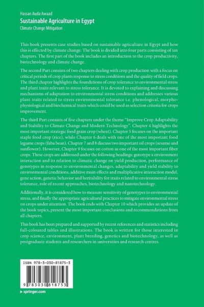 This book consists of 10 Chapters in 4 Parts. The first Part is an introduction and contains Chapter 1 to introduce the book chapters to the audiences. The second Part consists of two chapters under the name, Impact of Climate Change on Crop Production and the Physiological and Biochemical Basis for Crops Tolerance. The Chapter 2 focus on critical periods of crop plants to stress conditions and the expected impacts of climate changes mainly on the productivity and quality of field crops. While, Chapter 3 highlights the foundations of crop tolerance to environmental stress and plant traits relevant to stress tolerance. It is devoted to explain and discuss mechanisms of adaptation to environmental stress conditions and addresses various plant traits related to stress environmental tolerance i.e. phenological, morpho-physiological and biochemical traits which could be used as selection criteria for crops improvement. The third Part consists of 5 Chapters under the theme "Improve Crop Adaptability and Stability to Climate Change and Modern Technology". Chapter 4 highlights the most important strategic food grain crop (wheat), Chapter 5 focuses the important staple food crop (rice), while Chapter 6 deals with one of the most important food legume crops (faba bean). Chapter 7 and 8 discuss two important oil crops (sesame and sunflower). However, Chapter 9 focuses on cotton as one of the most important fiber crops. The author addresses these crops under the following headings: genotype x environment interaction and its relation to climatic change on yield production, performance of genotypes in response to environmental changes, adaptability and yield stability to environmental conditions, additive main effects and multiplicative interaction model, gene action, genetic behavior and heritability for traits related to environmental stress tolerance, role of recent approaches, biotechnology and nanotechnology. This is besides how can measure sensitivity of genotypes to environmental stress, and finally the appropriate agricultural practices to mitigate environmental stress on crops under attention. The book ends with Chapter No. 10 where the author presents an update of the book topics, present the most important conclusions and recommendations from all chapters.
