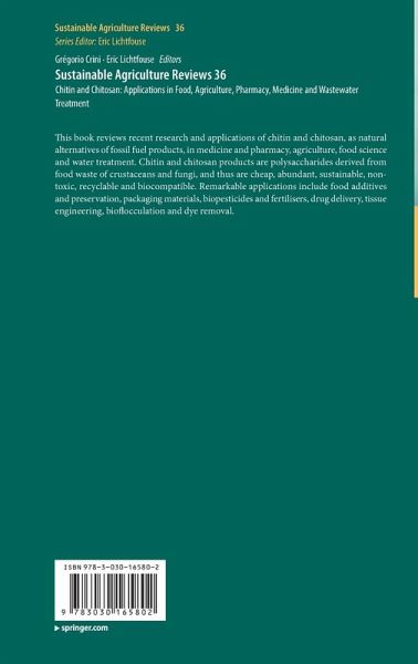 This book reviews recent research and applications of chitin and chitosan, as natural alternatives of fossil fuel products, in medicine and pharmacy, agriculture, food science and water treatment. Chitin and chitosan products are polysaccharides derived from food waste of crustaceans and fungi, and thus are cheap, abundant, sustainable, non-toxic, recyclable and biocompatible. Remarkable applications include food additives and preservation, packaging materials, biopesticides and fertilisers, drug delivery, tissue engineering, bioflocculation and dye removal.