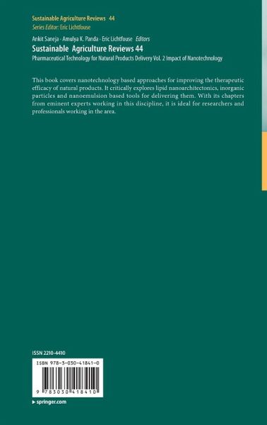 Dr. Ankit Saneja is a research aassociate at National Institute of Immunology, New Delhi, India. He has received his Ph.D. from the Academy of Scientific and Innovative Research (AcSIR) at the CSIR-Indian Institute of Integrative Medicine, Jammu. Dr. Saneja has to his credit several international publications. His research interest includes exploring different types of novel drug delivery systems for various biomedical applications. Dr. Amulya K. Panda is a Scientist at National Institute of Immunology (NII), New Delhi for last 29 years. Currently he is the director of NII. He has published more than 130 research papers, ten book chapters and an inventor of more than 30 issued or pending patents. Dr. Panda has the credentials of generating highest number of IPRs while working at National Institute of Immunology. He has also transferred technology for large scale production of therapeutic protein to Industry. Dr. Eric Lichtfouse is a biogeochemist at Aix Marseille University who has invented carbon-13 dating, a molecular-level method allowing to study the dynamics of organic compounds in temporal pools of complex media. He is Chief Editor of the journal Environmental Chemistry Letters, and the book series Sustainable Agriculture Reviews and Environmental Chemistry for a Sustainable World.He is the author of the book Scientific Writing for Impact Factor Journals, which includes an innovative writing tool: the Micro-Article.
