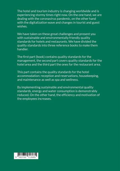 The hotel and tourism industry is changing worldwide and is experiencing stormy times right now. On the one hand, we are dealing with the coronavirus pandemic, on the other hand with the digitalization wave and changes in tourist and guest wishes. We have taken on these great challenges and present you with sustainable and environmentally friendly quality standards for hotels and restaurants. We have divided the quality standards into three reference books to make them handier.The first part (book) contains quality standards for the management, the second part covers quality standards for the hotel area and the third part the ones for the restaurant area.This part contains the quality standards for the hotel accommodation: reception and reservations, housekeeping, and maintenance as well as spa and wellness.By implementing sustainable and environmental quality standards, energy and water consumption is demonstrably reduced. On the other hand, the efficiency and motivation of the employees increases.