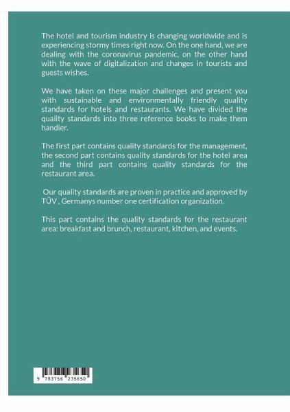 The hotel and tourism industry is changing worldwide and is experiencing stormy times right now. On the one hand, we are dealing with the coronavirus pandemic, on the other hand with the wave of digitalization and changes in tourists and guests wishes. We have taken on these major challenges and present you with sustainable and environmentally friendly quality standards for hotels and restaurants. We have divided the quality standards into three reference books to make them handier.The first part contains quality standards for the management, the second part contains quality standards for the hotel area and the third part contains quality standards for the restaurant area. Our quality standards are proven in practice and approved by TÜV , Germanys number one certification organization.This part contains the quality standards for the restaurant area: breakfast and brunch, restaurant, kitchen, and events.