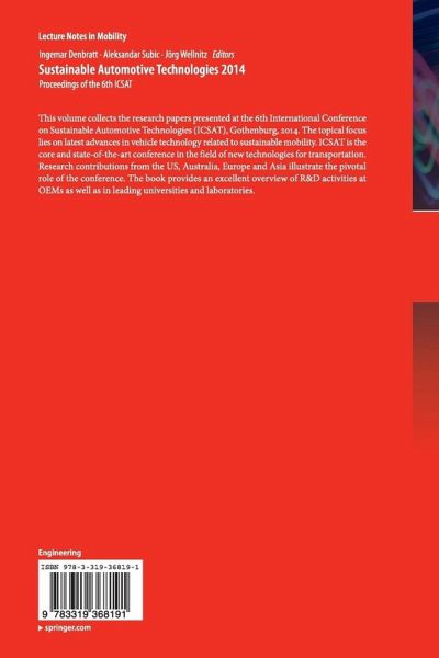 This volume collects the research papers presented at the 6th International Conference on Sustainable Automotive Technologies (ICSAT), Gothenburg, 2014. The topical focus lies on latest advances in vehicle technology related to sustainable mobility. ICSAT is the core and state-of-the-art conference in the field of new technologies for transportation. Research contributions from the US, Australia, Europe and Asia illustrate the pivotal role of the conference. The book provides an excellent overview of R&D activities at OEMs as well as in leading universities and laboratories.