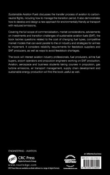 The book will interest aviation industry professionals, fuel producers, airline fuel buyers, airport operators and propulsion engineers working on SAF production. Aviation, aerospace and business students taking courses in propulsion,gas turbine emissions, air transport management, supply chain development and sustainable energy production will find the book useful as well.