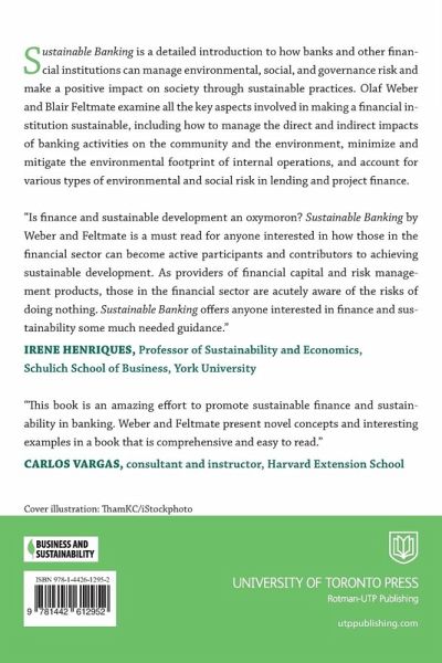 Sustainable Banking introduces business leaders and students to the many ways in which financial institutions can manage their environmental and social impact and meet the needs of the current generation without compromising the needs of future generations. Olaf Weber and Blair Feltmate go beyond the business case for sustainability: how managing environmental, social, and governance risk can contribute to a bank’s bottom line – to make the sustainability case for banking: how banks and other financial institutions can make a positive impact on society. In their book, Weber and Feltmate discuss the key aspects involved in making a financial institution sustainable: how to manage the direct and indirect impacts of banking activities on the community and the environment, how to minimize and mitigate the environmental footprint of internal operations, and how to account for various types of environmental and social risk in lending and project finance. They also introduce sustainable banking products and strategies being adopted by industry leaders, such as responsible investing, social finance, and impact lending.