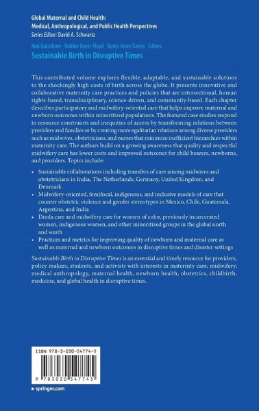 Chapter 1. Introduction: Sustainable Birth in Disruptive Times.- Chapter 2. Sustainable Midwifery.- Chapter 3. Bringing Back Breech by Reframing the Language of Risk.- Chapter 4. From Home to Hospital: Sustainable Transfers of Care in the United States.- Chapter 5. Structures for Sustainable Collaboration Between Midwives and Obstetricians in the Netherlands: The Obstetrics and Midwifery Manual and Perinatal Care Partnerships.- Chapter 6. Re/Envisioning Birth Work: Community-Based Doula Training for Low-Income and Previously Incarcerated Women in the United States.- Chapter 7. Sustainable Metrics: Using Measurement-Based Quality Improvement to Improve Maternity Practice While Avoiding Frustration and Pitfalls.- Chapter 8. Unsustainable Surrogacy Practices: What We Can Learn from a Comparative Assessment.- Chapter 9. Childbirth in Chile: Winds of Change.- Chapter 10. Humanizing Care at the Maternity Hospital Estela de Carlotto in Buenos Aires: Providers Relearning Their Roles.-Chapter 11. Luna Maya Birth Centers in Mexico: A Network for Femifocal Care.- Chapter 12. Reconstructing Referrals: Overcoming Barriers to Quality Obstetric Care for Maya Women in Guatemala Through Care Navigation.- Chapter 13. A Sustainable Model of Assessing Maternal Health Needs and Improving Quality of Care During and After Pregnancy.- Chapter 14. Sustainable Maternal and Newborn Care in India: A Case Study from Ladakh.- Chapter 15. Giving Birth at Home in Resource-Scarce Regions of India: An Argument for Making the Women-Centric Approach of the Traditional Dais Sustainable.- Chapter 16. It Takes More than a Village: Building a Network of Safety in Nepal's Mountain Communities.- Chapter 17. Tranquil Birth: Revising Risk to Sustain Spontaneous Vaginal.- Chapter 18. Sustainable Birth Care in Disaster Zones and During Pandemics: Low-Tech, Skilled Touch.- Ch 19. Sustainable Newborn Care: Helping Babies Breathe and Essential Newborn.- Chapter 20. Conclusion: Sustainable Maternity Care in Disruptive.