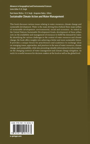 This book discusses various issues relating to water resources, climate change and sustainable development. Water is the main driving force behind three major pillars of sustainable development: environmental, social and economic. As stated in the United Nations Sustainable Development Goals, development of these pillars rests on the availability and management of resources to fulfill the demand for water. By identifying the various challenges in the context of water resources and climate change, the book offers insights into achieving a better and more sustainable future. It provides a unique forum for practitioners and academics to exchange ideas on emerging issues, approaches, and practices in the area of water resources, climate change, and sustainability, while also presenting valuable information for policymakers on the changing contours of water management and climate change mitigation. As such it is a useful resource for decision-makers at the local as well as the global level.