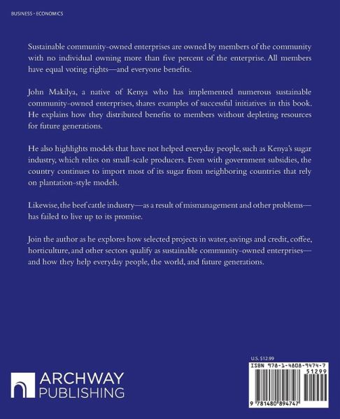 Sustainable community-owned enterprises are owned by members of the community with no individual owning more than five percent of the enterprise. All members have equal voting rights-and everyone benefits. John Makilya, a native of Kenya who has implemented numerous sustainable community-owned enterprises, shares examples of successful initiatives in this book. He explains how they distributed benefits to members without depleting resources for future generations. He also highlights models that have not helped everyday people, such as Kenya's sugar industry, which relies on small-scale producers. Even with government subsidies, the country continues to import most of its sugar from neighboring countries that rely on plantation-style models. Likewise, the beef cattle industry-as a result of mismanagement and other problems-has failed to live up to its promise. Join the author as he explores how selected projects in water, savings and credit, coffee, horticulture, and other sectors qualify as sustainable community-owned enterprises-and how they help everyday people, the world, and future generations.