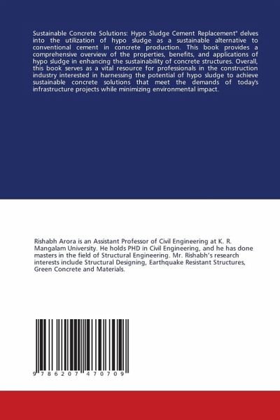 Sustainable Concrete Solutions: Hypo Sludge Cement Replacement" delves into the utilization of hypo sludge as a sustainable alternative to conventional cement in concrete production. This book provides a comprehensive overview of the properties, benefits, and applications of hypo sludge in enhancing the sustainability of concrete structures. Overall, this book serves as a vital resource for professionals in the construction industry interested in harnessing the potential of hypo sludge to achieve sustainable concrete solutions that meet the demands of today's infrastructure projects while minimizing environmental impact.