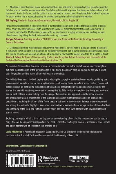 "Sustainable consumption is a grand challenge of our time, and this long-awaited textbook positively fizzes with clarity and curiosity, guaranteed to spark engagement and inspiration. Middlemiss expertly relates major real-world problems and solutions to our everyday lives, grounding complex debates in an accessible, no-nonsense style. She helps us think critically about the stories we tell ourselves, about how we will live in the future, and the political action we need to take us there. Unashamedly infused with a passion for social justice, this is essential reading for students and scholars of sustainable consumption." -- Gill Seyfang, Reader in Sustainable Consumption, University of East Anglia, UK