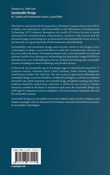 This book is concerned with the importance of Human Computer Interaction (HCI), Usability, user participants, and Sustainability in the Information Communication Technology (ICT) industry throughout the world. ICTs have become a crucial instrument for communication, entertainment, commerce and research and this increased usage is presenting new environmental and sustainability issues as we try and meet the ever-growing needs of both businesses and individuals.