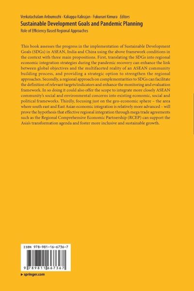 This book assesses the progress in the implementation of Sustainable Development Goals (SDGs) in ASEAN, India and China using the above framework conditions in the context with three main propositions. First, translating the SDGs into regional economic integration strategies during the pandemic recovery can enhance the link between global objectives and the multifaceted reality of an ASEAN community building process, and providing a strategic option to strengthen the regional approaches. Secondly, a regional approach on complementarities to SDGs can facilitate the definition of relevant targets/indicators and enhance the monitoring and evaluation framework. In so doing it could also offer the scope to integrate more closely ASEAN community's social and environmental concerns into existing economic, social and political frameworks. Thirdly, focusing just on the geo-economic sphere - the area where south east and East Asian economic integration is relatively more advanced - will prove the hypothesis that effective regional integration through mega trade agreements such as the Regional Comprehensive Economic Partnership (RCEP) can support the Asia's transformation agenda and foster more inclusive and sustainable growth.