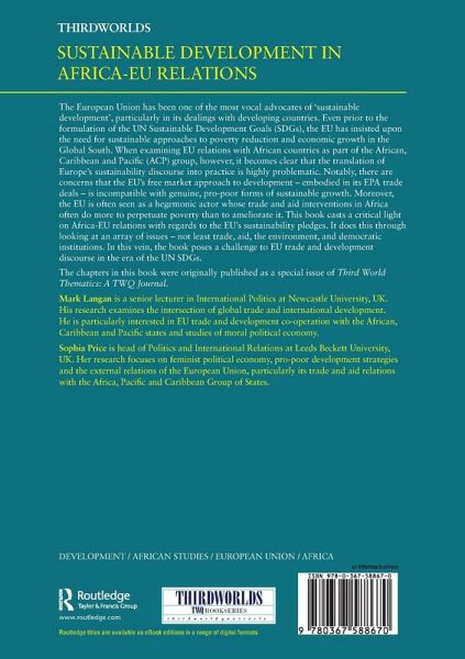 The European Union has been one of the most vocal advocates of 'sustainable development', particularly in its dealings with developing countries. Even prior to the formulation of the UN Sustainable Development Goals (SDGs), the EU has insisted upon the need for sustainable approaches to poverty reduction and economic growth in the Global South. When examining EU relations with African countries as part of the African, Caribbean and Pacific (ACP) group, however, it becomes clear that the translation of Europe's sustainability discourse into practice is highly problematic. Notably, there are concerns that the EU's free market approach to development - embodied in its EPA trade deals - is incompatible with genuine, pro-poor forms of sustainable growth. Moreover, the EU is often seen as a hegemonic actor whose trade and aid interventions in Africa often do more to perpetuate poverty than to ameliorate it. This book casts a critical light on Africa-EU relations with regards to the EU's sustainability pledges. It does this through looking at an array of issues - not least trade, aid, the environment, and democratic institutions. In this vein, the book poses a challenge to EU trade and development discourse in the era of the UN SDGs. The chapters in this book were originally published as a special issue in Third World Thematics: A TWQ Journal.