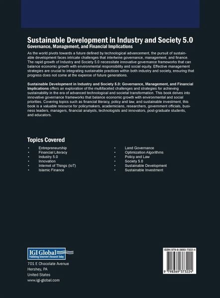 As the world pivots towards a future defined by technological advancement, the pursuit of sustainable development faces intricate challenges that intertwine governance, management, and finance. The rapid growth of Industry and Society 5.0 necessitate innovative governance frameworks that can balance economic growth with environmental responsibility and social equity. Effective management strategies are crucial to integrating sustainable practices within both industry and society, ensuring that progress does not come at the expense of future generations. Sustainable Development in Industry and Society 5.0: Governance, Management, and Financial Implications offers an exploration of the multifaceted challenges and strategies for achieving sustainability in the era of advanced technological and societal transformation. This book delves into innovative governance frameworks that balance economic growth with environmental and social priorities. Covering topics such as financial literacy, policy and law, and sustainable investment, this book is a valuable resource for policymakers, academicians, researchers, government officials, business leaders, managers, financial analysts, technologists and innovators, post-graduate students, and educators.