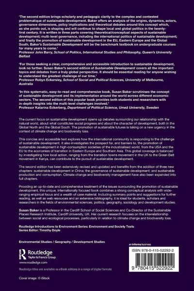"The second edition brings scholarly and pedagogic clarity to the complex and contested problematique of sustainable development. Baker offers a analysis of the origins, dynamics, actors, governance dimensions, policy implications and theoretical debates around this concept which as she points out is and will continue to shape local and global politics in the 21st-century. It is written in an accessible and student-friendly style, in three parts covering theoretical/conceptual aspects of sustainable development; multi-level governance, including the international politics of sustainable development; and finally the promotion of sustainable development in the EU, eastern Europe and the global south. Baker's Sustainable Development will be the benchmark textbook on undergraduate courses for many years to come".