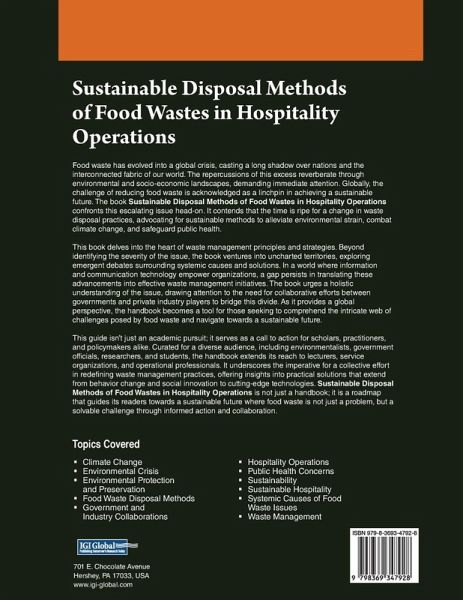 Food waste has evolved into a global crisis, casting a long shadow over nations and the interconnected fabric of our world. The repercussions of this excess reverberate through environmental and socio-economic landscapes, demanding immediate attention. Globally, the challenge of reducing food waste is acknowledged as a linchpin in achieving a sustainable future. The book Sustainable Disposal Methods of Food Wastes in Hospitality Operations confronts this escalating issue head-on. It contends that the time is ripe for a change in waste disposal practices, advocating for sustainable methods to alleviate environmental strain, combat climate change, and safeguard public health. This book delves into the heart of waste management principles and strategies. Beyond identifying the severity of the issue, the book ventures into uncharted territories, exploring emergent debates surrounding systemic causes and solutions. In a world where information and communication technology empower organizations, a gap persists in translating these advancements into effective waste management initiatives. The book urges a holistic understanding of the issue, drawing attention to the need for collaborative efforts between governments and private industry players to bridge this divide. As it provides a global perspective, the handbook becomes a tool for those seeking to comprehend the intricate web of challenges posed by food waste and navigate towards a sustainable future.