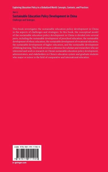 This book investigates the sustainable education policy development in China in the aspects of challenges and strategies. In this book, the conceptual model of the sustainable education policy development in China is divided into several parts, including the sustainable development of preschool education, the sustainable development of ethnic education, the sustainable development of vocational education, the sustainable development of higher education, and the sustainable development of lifelong learning. This book serves as a reference for scholars and researchers who are interested and work in research on China's sustainable education policy development, administrators, and stakeholders in China's education system and graduate students who major or minor in the field of comparative and international education.