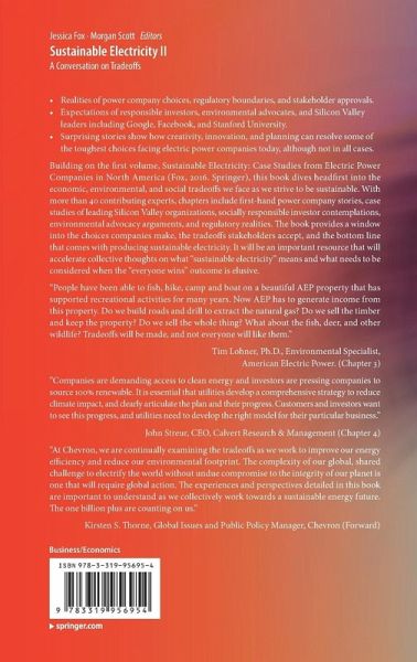 Building on the first volume, Sustainable Electricity: Case Studies from Electric Power Companies in North America (Fox, 2016. Springer), this book dives headfirst into the economic, environmental, and social tradeoffs power companies face as they strive to be sustainable. With more than 40 contributing experts, chapters include first-hand power company stories, case studies of leading Silicon Valley organizations; socially responsible investor contemplations; environmental advocacy arguments; and regulatory realities. The book providesa window into the choices companies make, the tradeoffs stakeholders accept, and the bottom line that comes with producing sustainable electricity. It will be an important resource that will accelerate collective thoughts on what 'sustainable electricity' means and what needs to be considered when the "everyone wins" outcome is elusive.