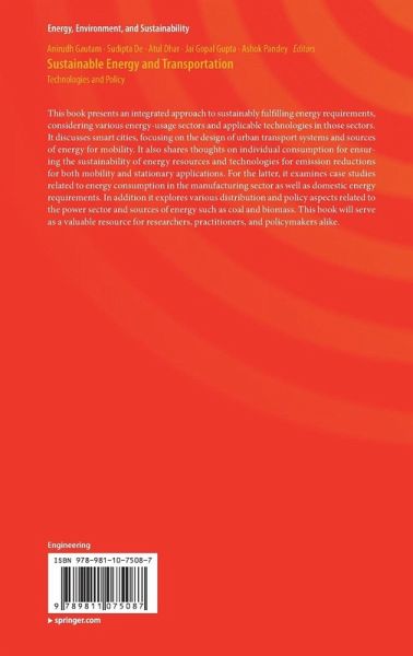This book presents an integrated approach to sustainably fulfilling energy requirements, considering various energy-usage sectors and applicable technologies in those sectors. It discusses smart cities, focusing on the design of urban transport systems and sources of energy for mobility. It also shares thoughts on individual consumption for ensuring the sustainability of energy resources and technologies for emission reductions for both mobility and stationary applications. For the latter, it examines case studies related to energy consumption in the manufacturing sector as well as domestic energy requirements. In addition it explores various distribution and policy aspects related to the power sector and sources of energy such as coal and biomass. This book will serve as a valuable resource for researchers, practitioners, and policymakers alike.