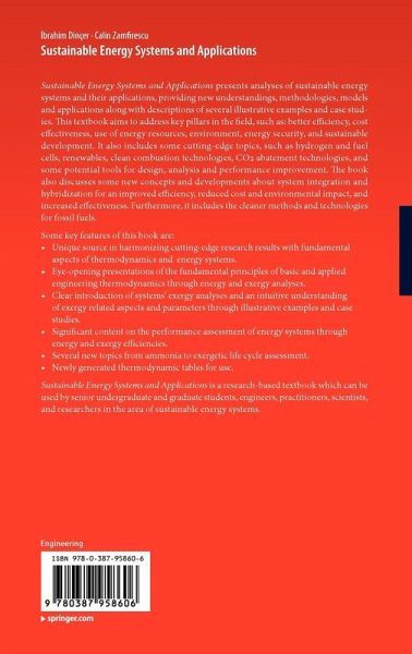 The concept of sustainable development was first introduced by the Brundtland Commission almost 20 years ago and has received increased attention during the past decade. It is now an essential part of any energy activities. This is a research-based textbook which can be used by senior undergraduate students, graduate students, engineers, practitioners, scientists, researchers in the area of sustainable energy systems and aimed to address some key pillars: better efficiency, better cost effectiveness, better use of energy resources, better environment, better energy security, and better sustainable development. It also includes some cutting-edge topics, such hydrogen and fuel cells, renewable, clean combustion technologies, CO2 abatement technologies, and some potential tools (exergy, constructal theory, etc.) for design, analysis and performance improvement.