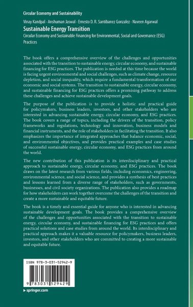 The new contribution of this publication is its interdisciplinary and practical approach to sustainable energy, circular economy, and ESG practices. The book draws on the latest research from various fields, including economics, engineering, environmental science, and social science, and provides a synthesis of best practices and lessons learned from a diverse range of stakeholders, such as governments, businesses, and civil society organizations. The publication also provides a roadmap for how stakeholders can work together overcome the challenges of the transition and createa more sustainable and equitable future.