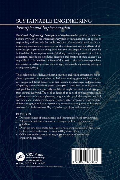 Sustainable Engineering: Principles and Implementation provides a comprehensive overview of the interdisciplinary field of sustainability as it applies to engineering and methods for implementation of sustainable practices. Due to increasing constraints on resources and on the environment and effects of climate change, engineers are being faced with new challenges. While it is generally believed that the concepts of sustainable design must be adhered to so that future generations may be protected, the execution and practice of these concepts are very difficult. It is therefore the focus of this book to give both a conceptual understanding as well as practical skills to apply sustainable engineering principles to engineering design. This book introduces relevant theory, principles, and ethical expectations for engineers, presents concepts related to industrial ecology, green engineering, and eco-design, and details frameworks that indicate the challenges and constraints of applying sustainable development principles. It describes the tools, protocols, and guidelines that are currently available through case studies and examples from around the world. The book is designed to be used by undergraduate and graduate students in any engineering program (with particular emphasis on civil, environmental and chemical engineering) and other programs in which sustainability is taught, in addition to practicing scientists and engineers and all others concerned with the sustainability of products, projects and processes. Specific Features: Discusses sources of contaminants and their impact on the environment Addresses sustainable assessment techniques, policies, protocols and guidelines Describes new tools and technologies for achieving sustainable engineering Includes social and economic sustainability dimensions Offers case studies demonstrating implementation of sustainable engineering practices