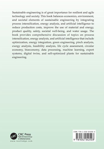 This book balances economics, environment, and societal elements of sustainable engineering by integrating process intensification, energy analysis, and artificial intelligence to reduce production costs, improve the use of material and energy, product quality, safety, societal well-being, and water usage.