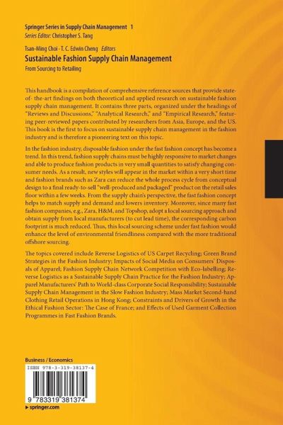This handbook is a compilation of comprehensive reference sources that provide state-of-the-art findings on both theoretical and applied research on sustainable fashion supply chain management. It contains three parts, organized under the headings of "Reviews and Discussions," "Analytical Research," and "Empirical Research," featuring peer-reviewed papers contributed by researchers from Asia, Europe, and the US. This book is the first to focus on sustainable supply chain management in the fashion industry and is therefore a pioneering text on this topic.