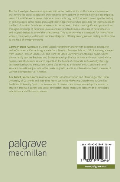 This book analyzes female entrepreneurship in the textile sector in Africa as a phenomenon that favors the social integration and economic development of women in certain geographical areas. It identifies entrepreneurship as an avenue through which women can escape the feeling of being trapped in the home and assert their independence while providing for their families. In the field of fashion, female entrepreneurs in resource-rich Africa have significant opportunities through knowledge of natural resources and cultural traditions, as the use of natural fabrics and original designs is one of the latest trends. This book provides a framework for how African women can develop sustainable fashion enterprises, offering an original and lasting contribution to the field of entrepreneurship.
