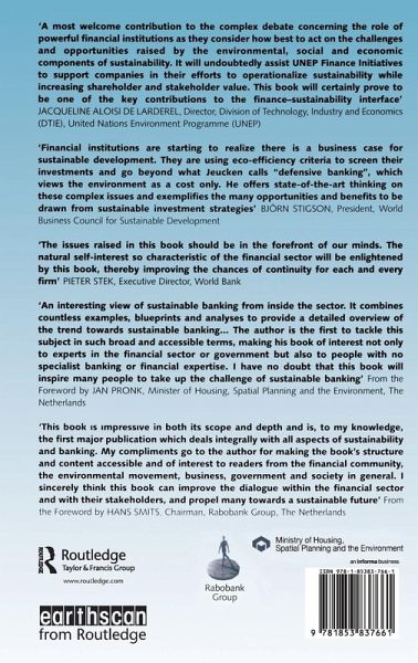 List of Boxes, Figures and Tables Foreword by Jan Pronk Foreword by Hans Smits Acknowledgements List of Acronyms and Abbreviations Introduction Part 1 Sustainability: A General Introduction: Environmental Consciousness and Sustainable Development Sustainability: The Challenge for Companies Sustainability: A Special Role for Banks Part 2 Banking and Sustainability: Sustainability, Markets and Banking Products Sustainability and Financing Risks Internal Environmental Care Organization and Communication about Sustainability Part 3 In Reflection: Sustainable Banking in Perspective: The Cases of 34 International Banks Sustainable Development: A Paradigm Shift Towards Sustainable Banking Appendices Glossary Notes References Index